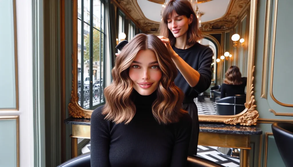 • Les textures comptent: des ondulations en S adoucissent et allongent mieux qu’un lissage plat. Et un balayage discret autour du visage crée des « rails » lumineux verticaux.